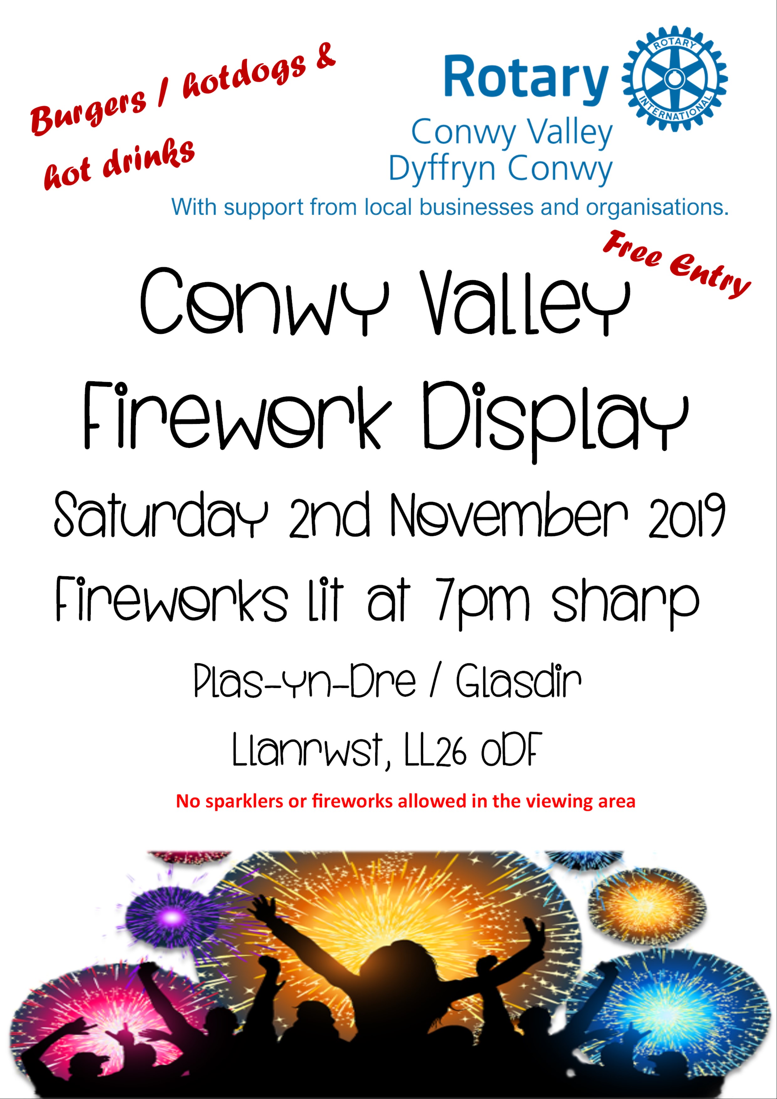 The annual Conwy Valley / Llanrwst Fireworks Spectacular was held on the evening of Saturday 2nd November 2019 at the Plas-yn-Dre (Glasdir) carpark in Llanrwst as usual and yet again this year it was a free display due to the sponsorship we get from many of the local businesses and organisations.