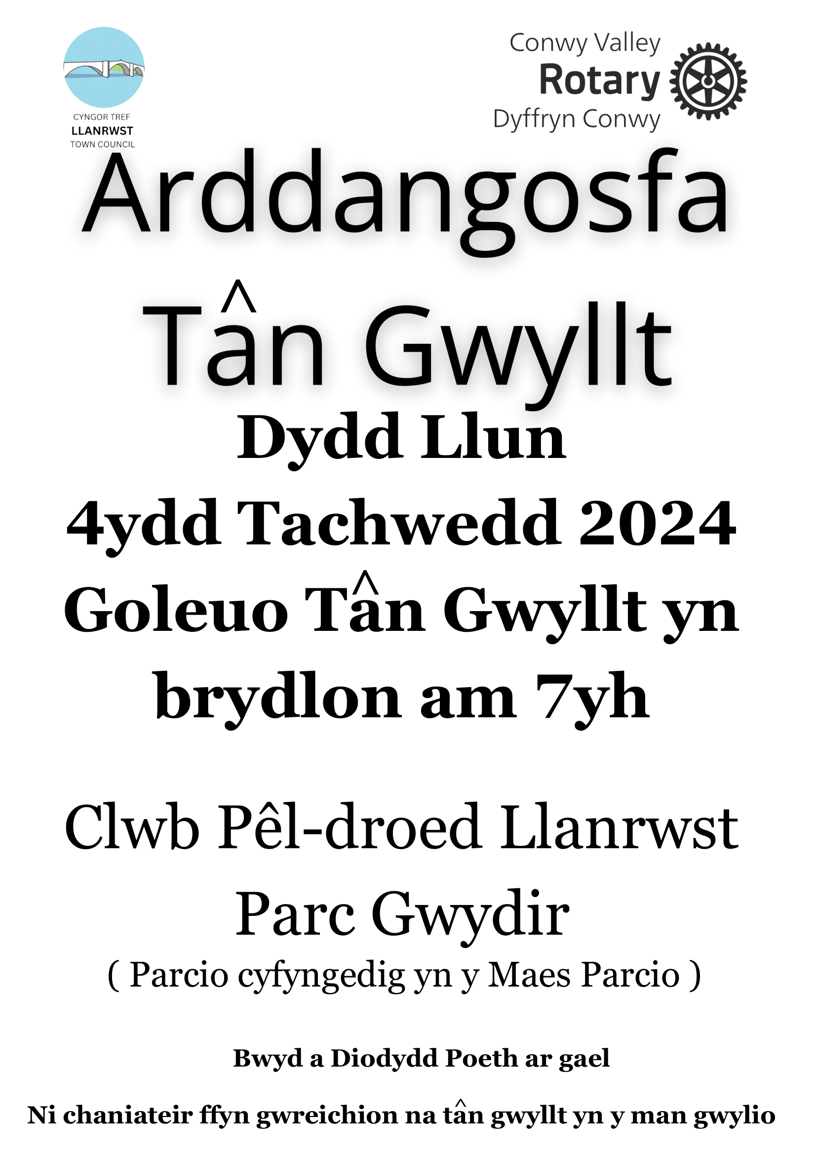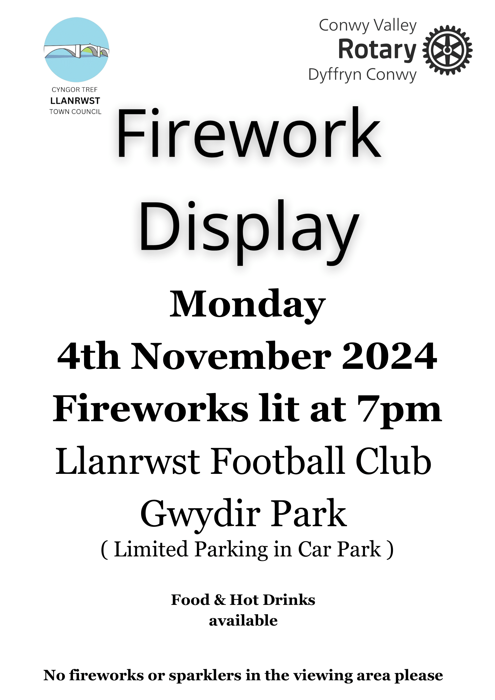 Join us on the evening of Monday 4th November 2024 at the Llanrwst Football Club, next to Gwydir Park. Yet again this year it is a free display due to the sponsorship we get from local businesses and organisations.