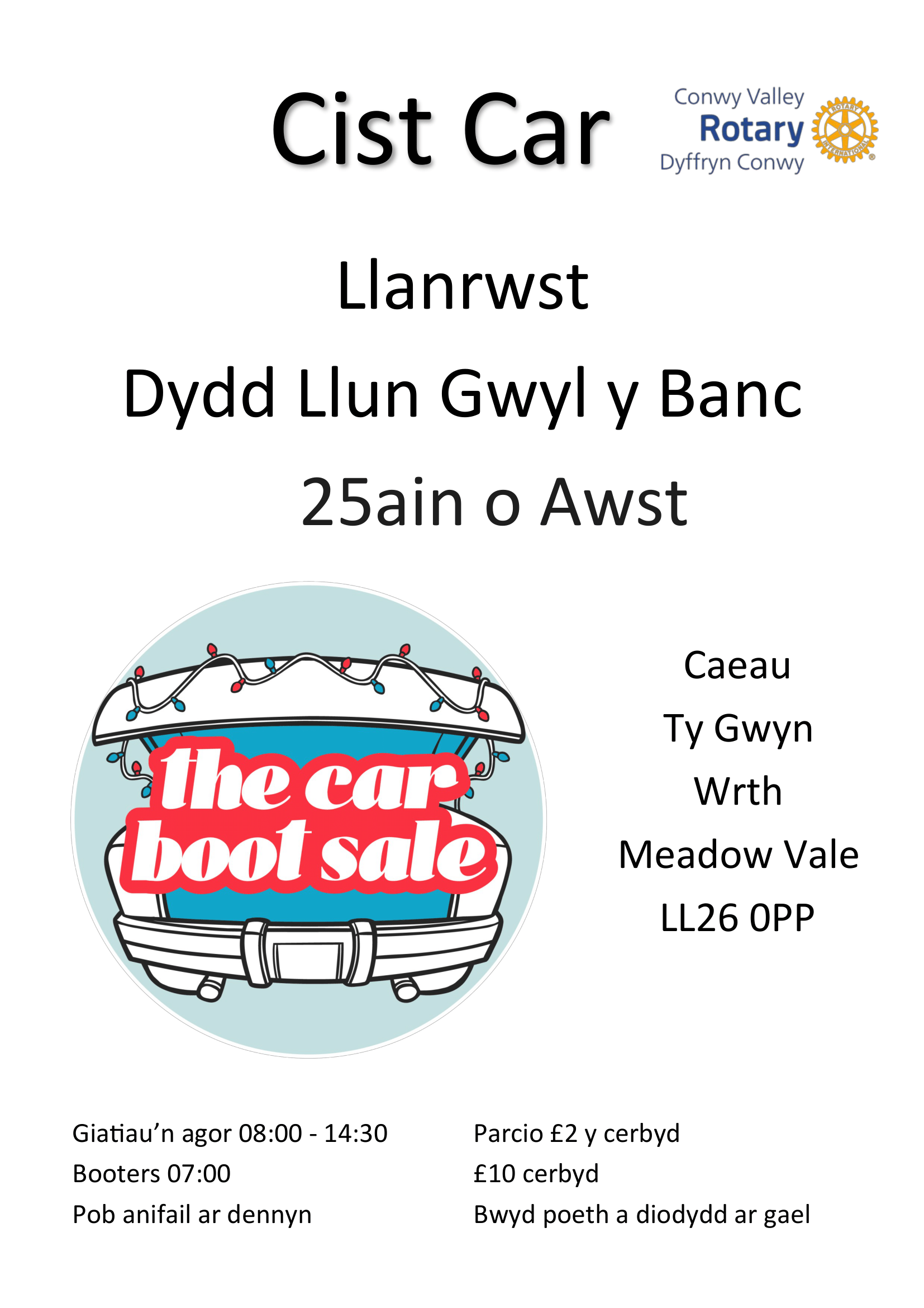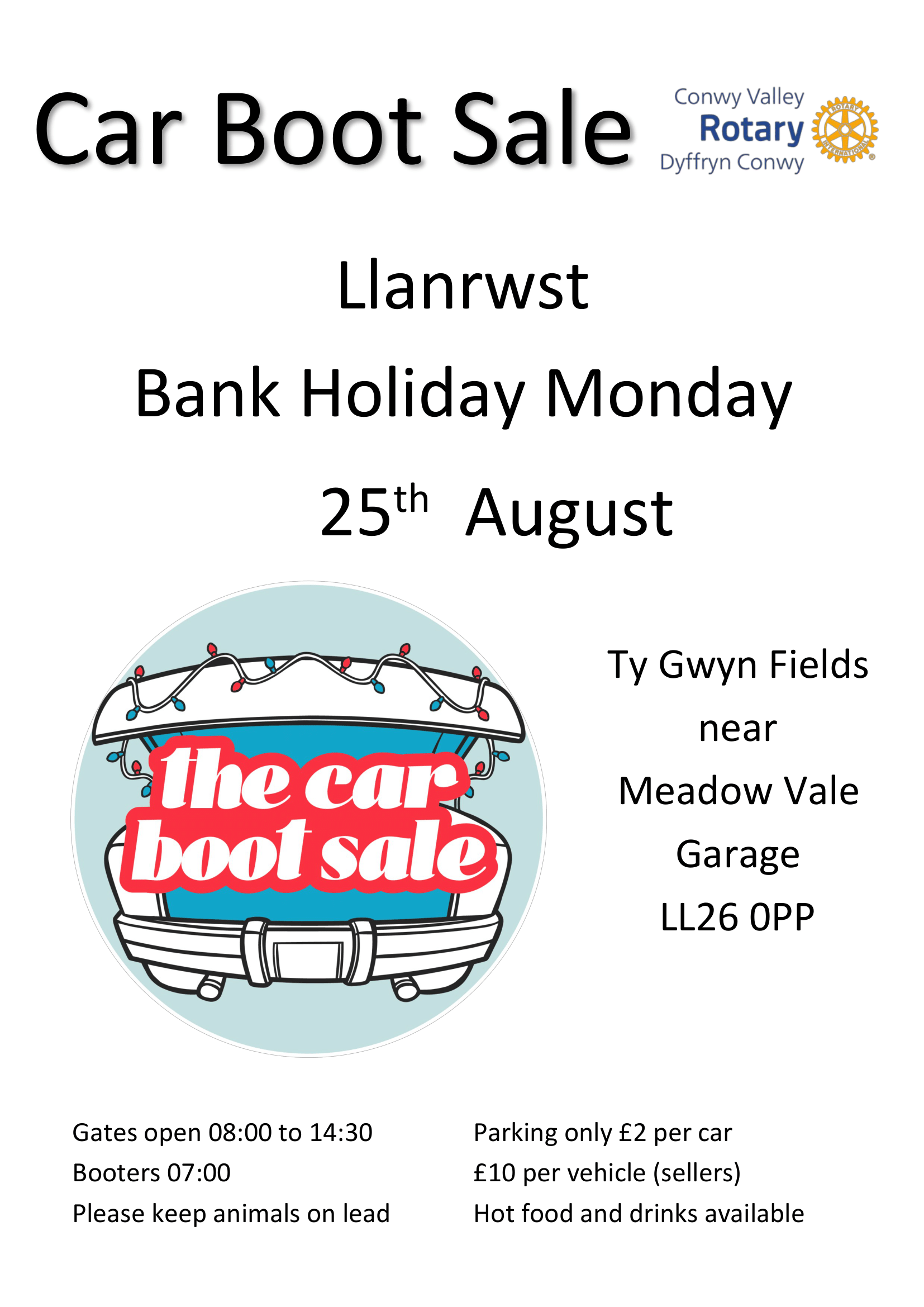 We are back for a car boot sale on the August Bank Holiday Monday, (the 25th of August), with the Llanrwst Car Boot Sale. All proceeds from entry to the event go towards Conwy Valley Rotary’s charitable work.