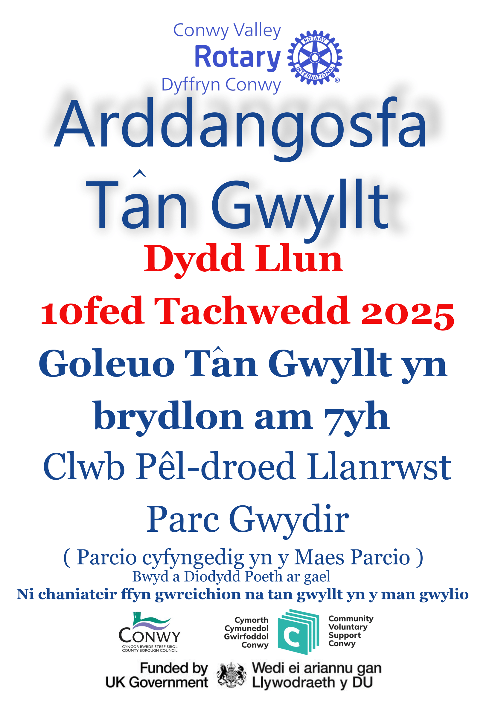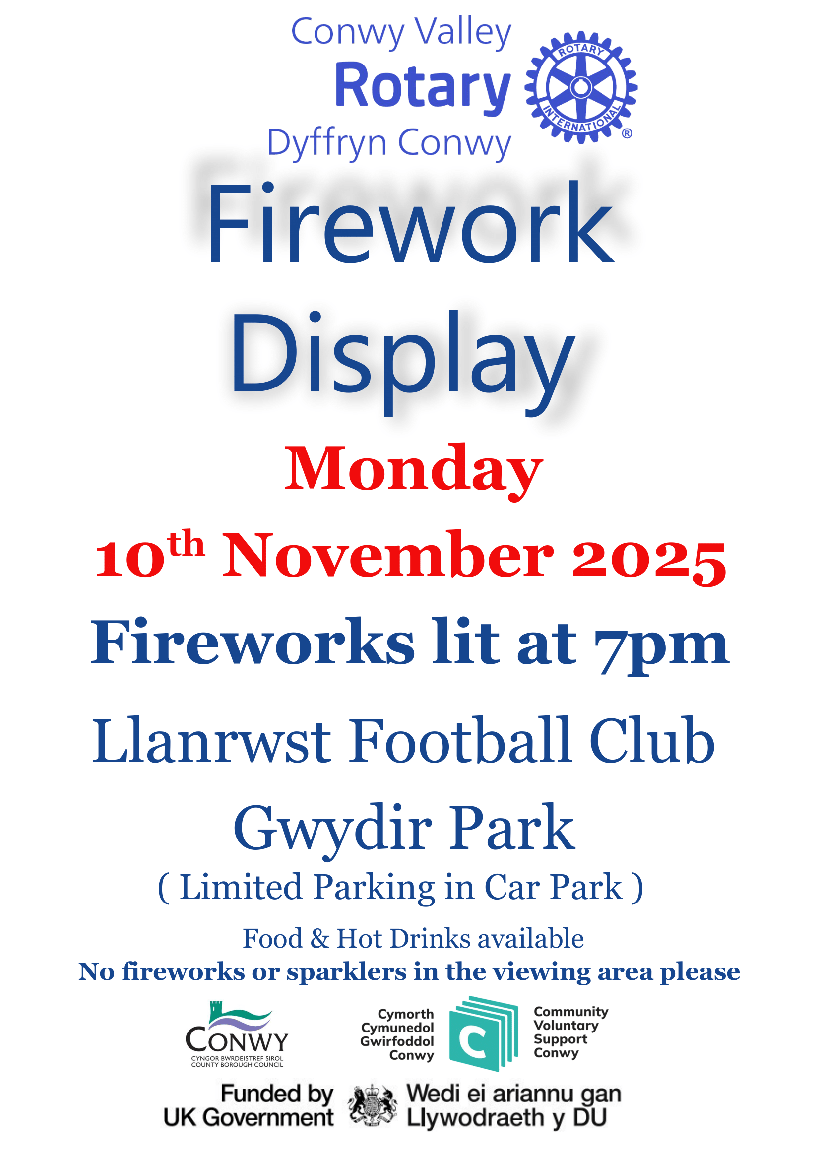 Join us on the evening of Monday 10th November 2025 at the Llanrwst Football Club, next to Gwydir Park (the same venue as last year). Yet again this year it is a free display due to the sponsorship we get from local businesses and other organisations.