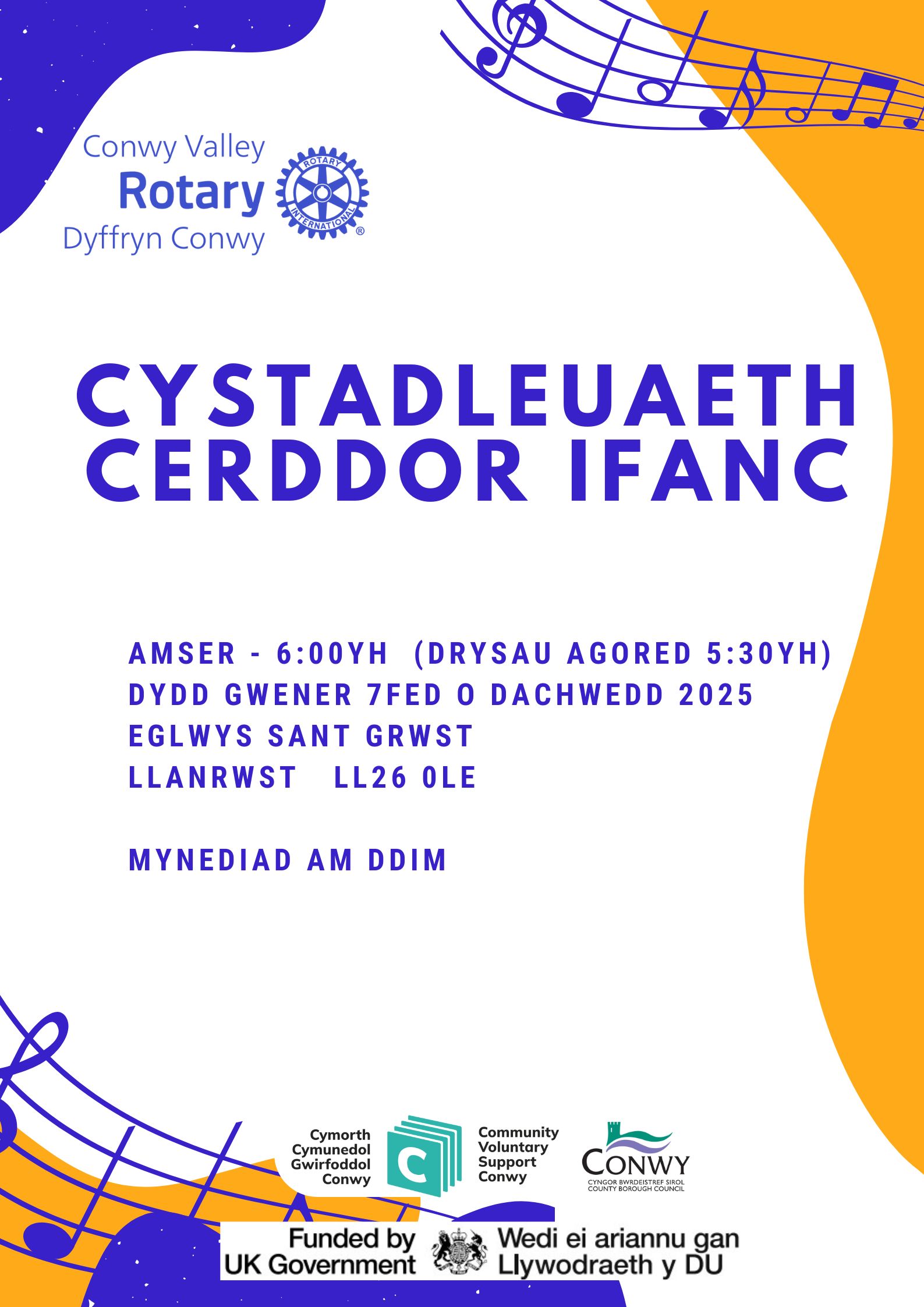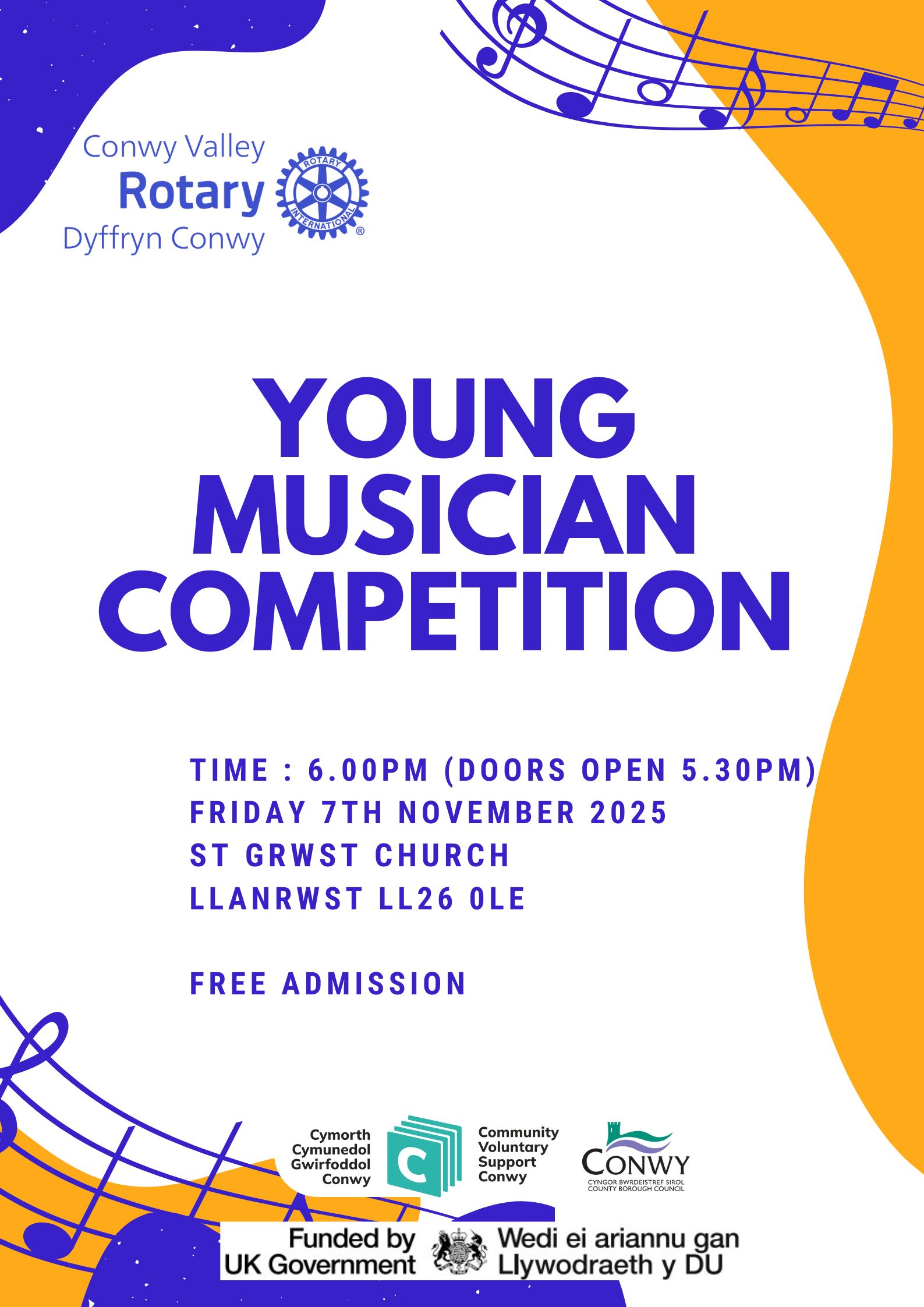 Young Musicians Competition 20256:00 pm - 9:00 pmWe're hosting our Young Musician Competition again this year. It's open to young Vocalists and Instrumentalists who live in the Conwy Valley - from Primary School age to Year 13. Come along to St Grwst Church in Llanrwst on Friday the 7th November to listen to some local talented young musicians. Free entry. We are pleased to thank CVSC, Conwy County Borough Council and the UK Government for funding for this event via the Shared Prosperity Fund (UK SPF). Special thanks goes to Mr. Owain Gethin Davies for his unwavering support in the organisation of this event. St Grwst's Church, Llanrwst, LL26 0LE MapExternal Event